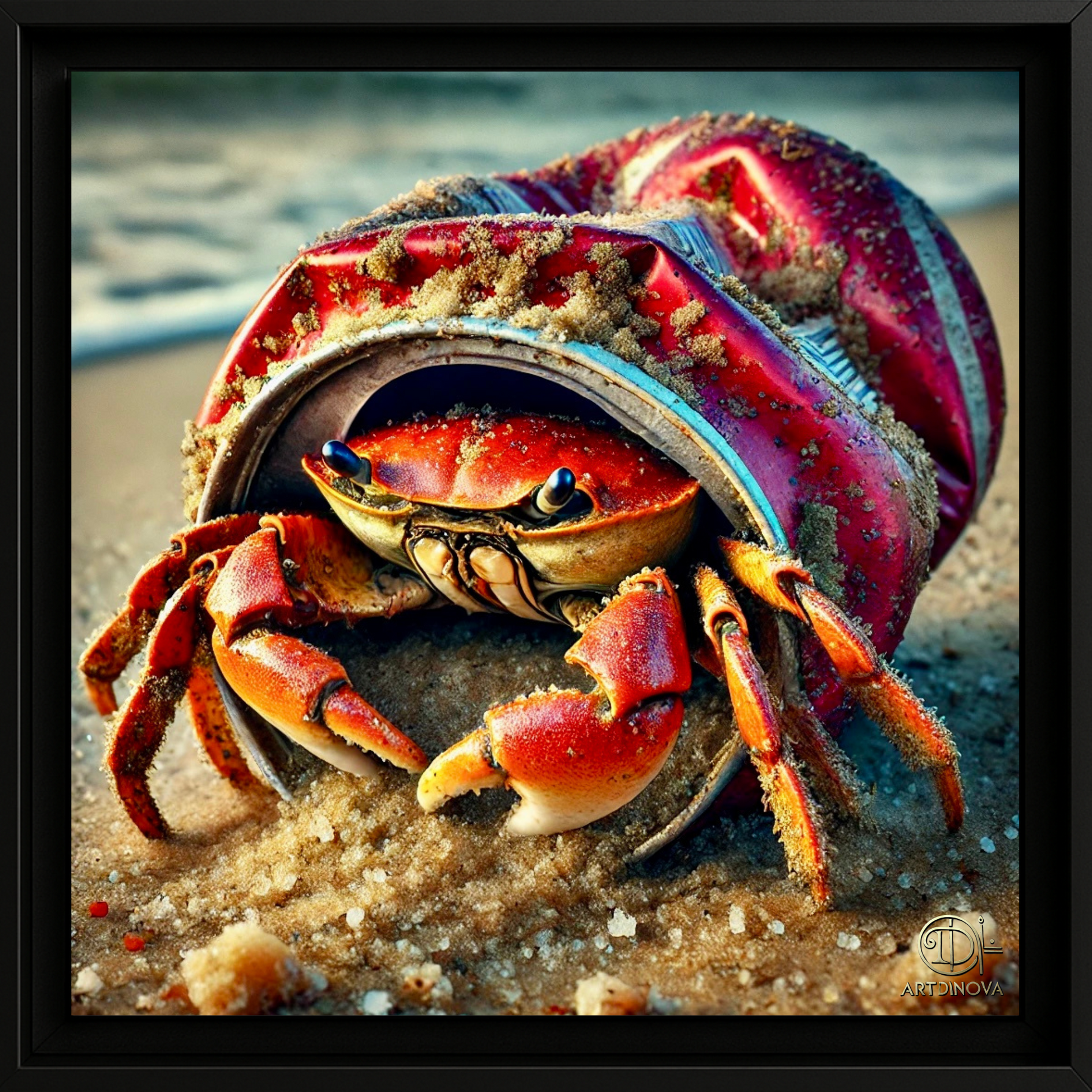 Sur le rivage, un crabe a trouvé refuge dans une canette abandonnée. Ce qui n’était qu’un déchet pour l’homme devient, pour lui, un abri provisoire.