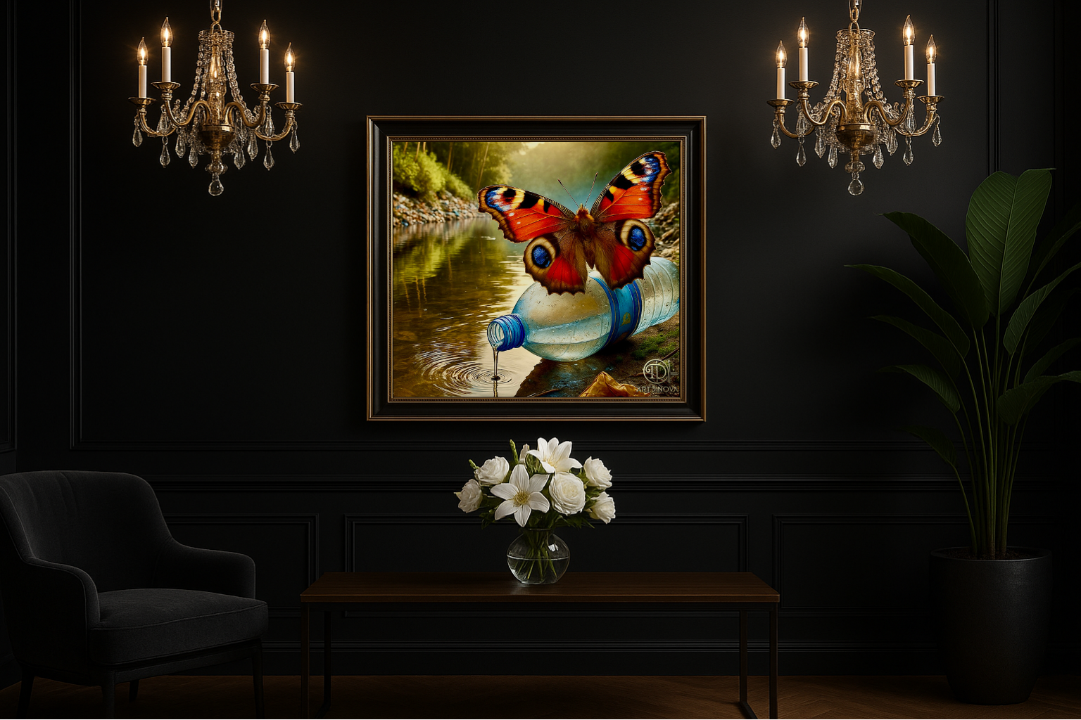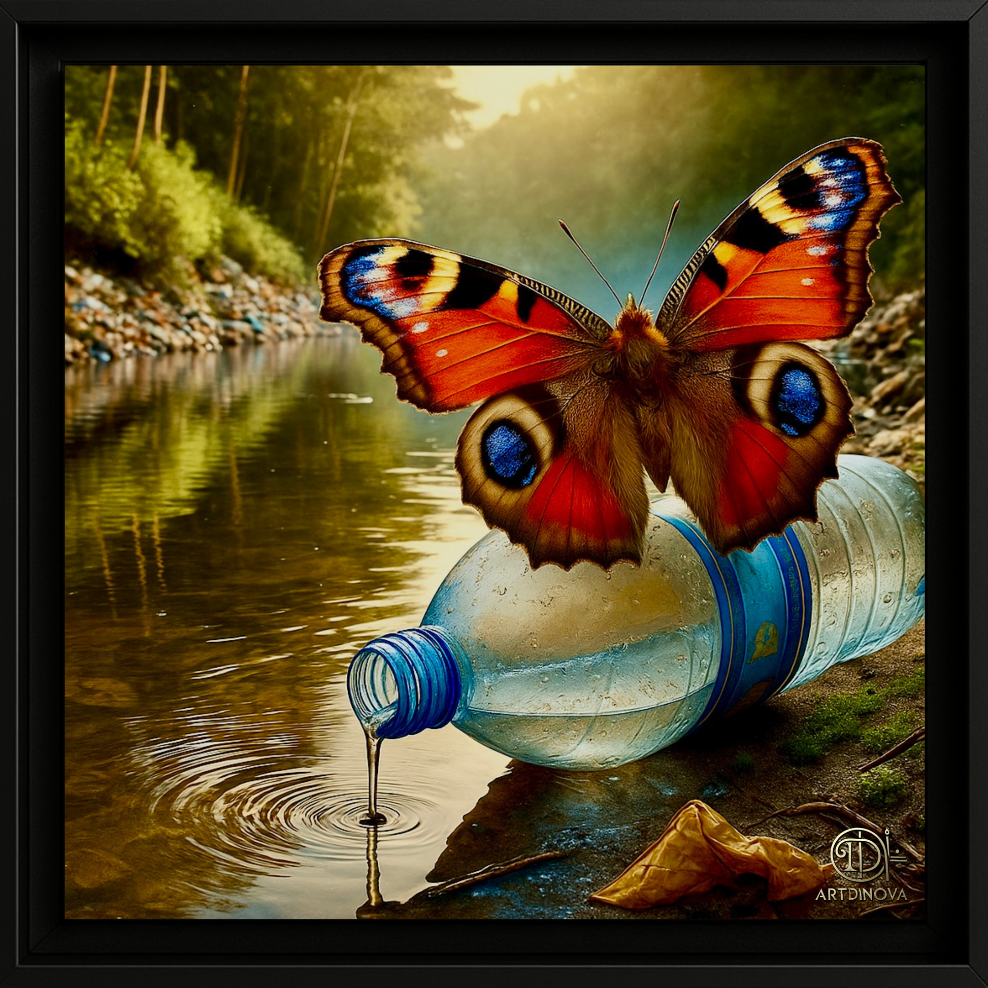 Un papillon aux couleurs flamboyantes se pose sur une simple bouteille abandonnée au bord d’une rivière. Le plastique, symbole de négligence, devient soudain le socle d’une beauté fragile et éphémère. La goutte qui s’en échappe trace des cercles dans l’eau, comme des échos de vie, des promesses de renouveau.