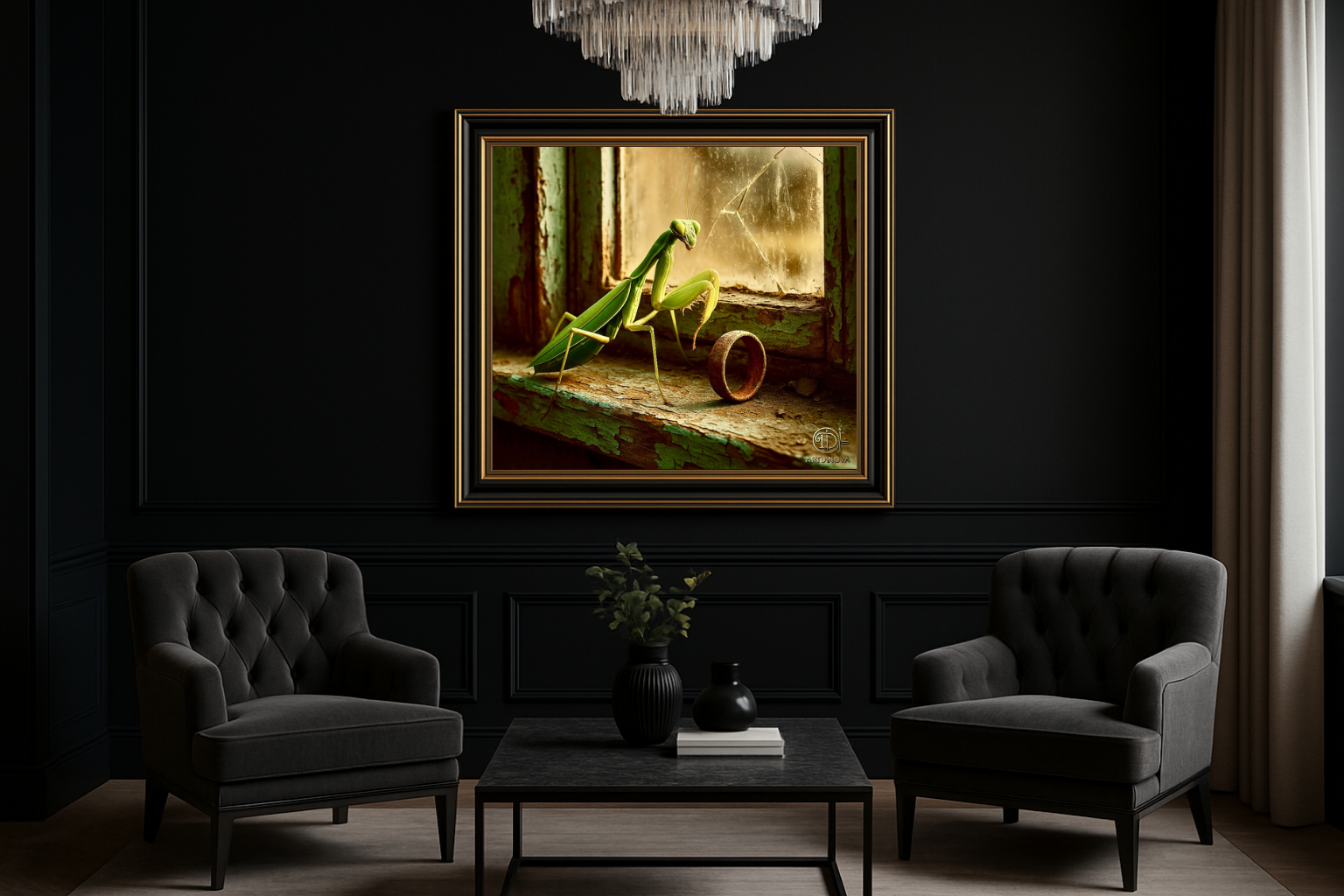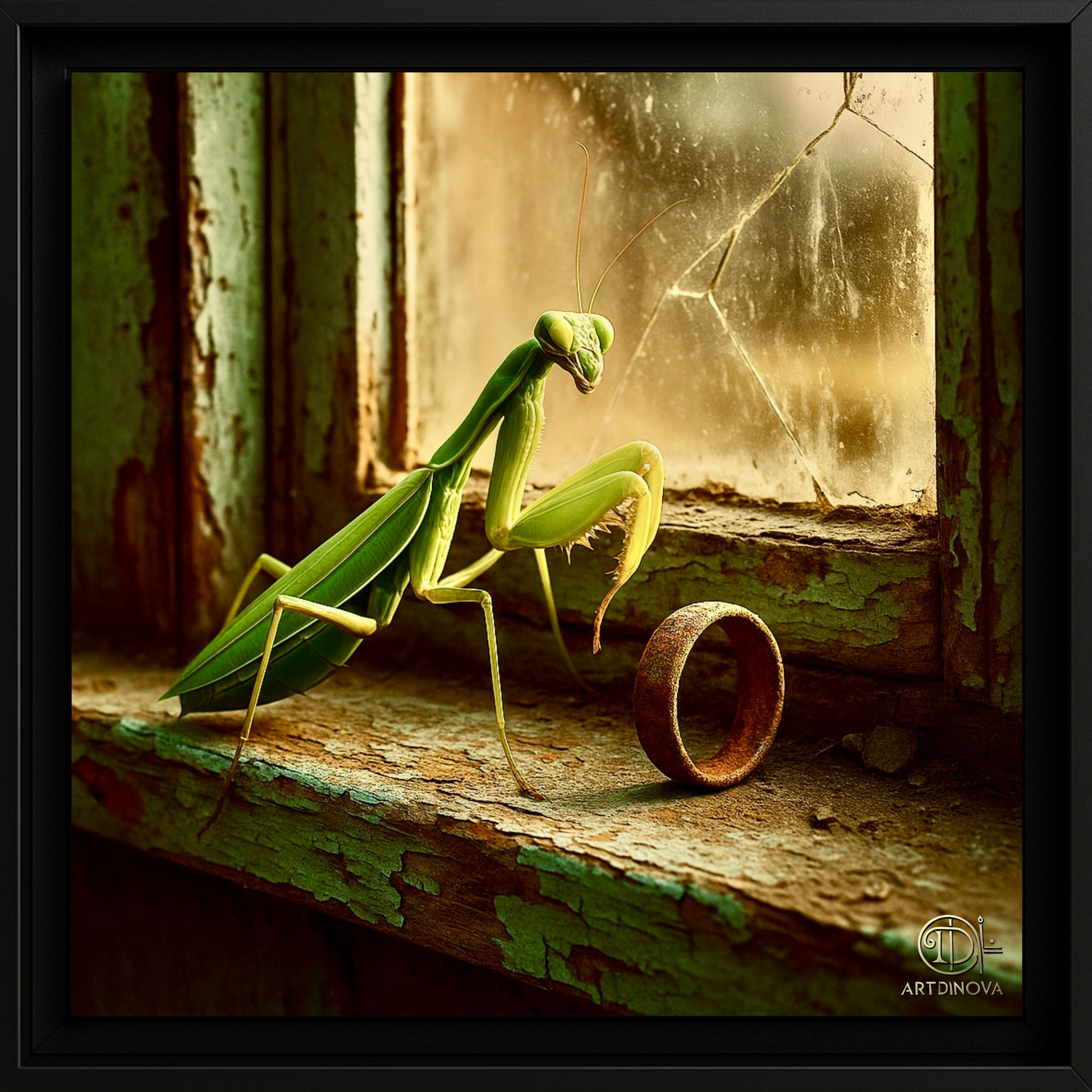 Une mante religieuse se tient immobile, presque en méditation, auprès d’un anneau rouillé posé sur un rebord usé. L’insecte, symbole de patience et de prière, semble veiller sur ce cercle de métal, vestige d’un engagement oublié ou d’un temps révolu.