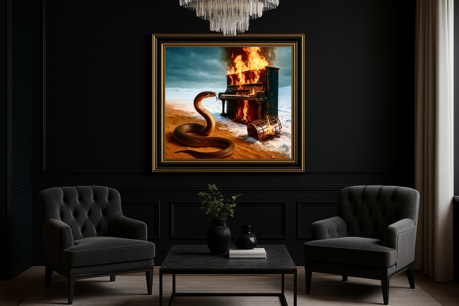 Un piano en flammes se consume au milieu d’un désert enneigé, tandis qu’un serpent, gardien ancestral des secrets, observe la scène. Le feu dévore l’instrument, symbole d’art et de civilisation, mais dans cette perte surgit une vérité : la musique ne s’éteint jamais, elle se transforme.
