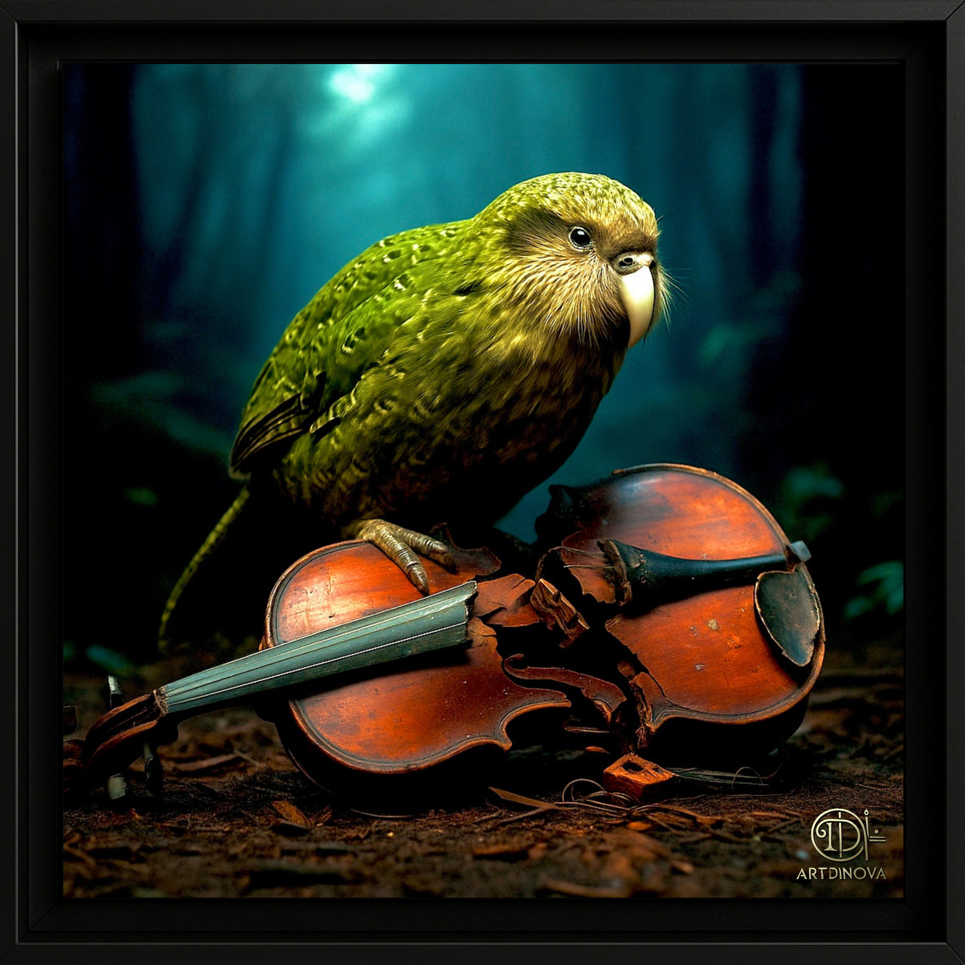 Un perroquet rare et majestueux se tient sur un violon fendu, comme pour rappeler que la musique ne s’éteint jamais vraiment. Le bois brisé, vestige d’un art humain fragile, contraste avec la vitalité de l’oiseau, porteur d’une mélodie éternelle.