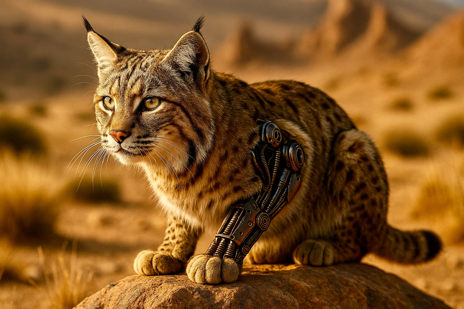 Parmi les dunes dorées émerge un lynx hybride — à la fois créature sauvage et machine futuriste. Ses yeux conservent l’intensité primitive de la vie sauvage, tandis que sa patte métallique révèle une fusion entre l’instinct et la technologie. Symbole de survie et d’adaptation, il incarne la force d’un monde où l’organique et l’artificiel s’unissent en parfaite harmonie.