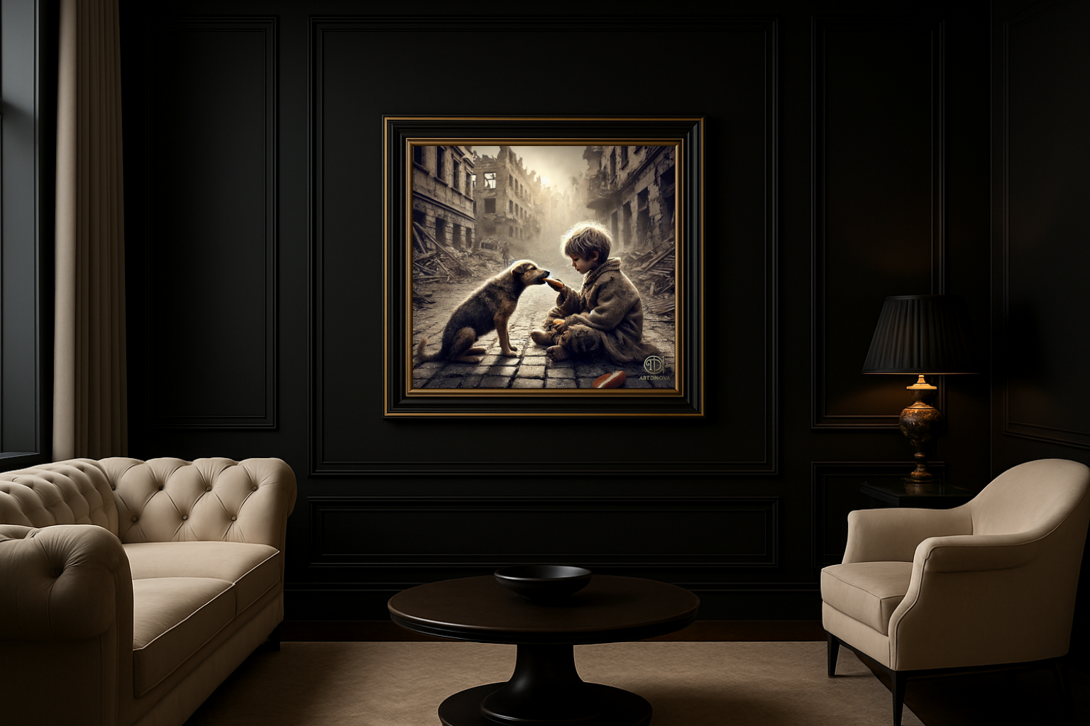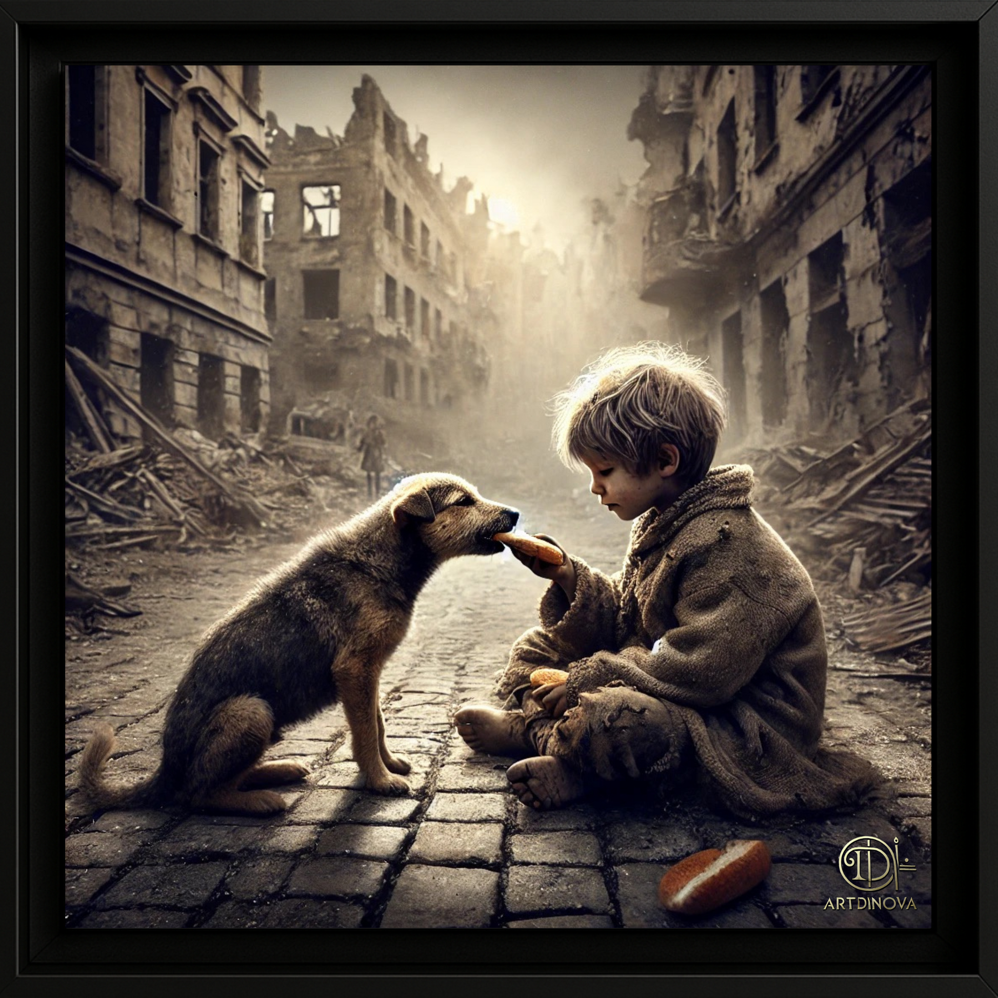 Un enfant, assis pieds nus dans une ville détruite, tend un morceau de pain à un chien affamé. La scène, bien qu’entourée de chaos et de désolation, éclaire l’humanité dans ce qu’elle a de plus pur : la générosité.