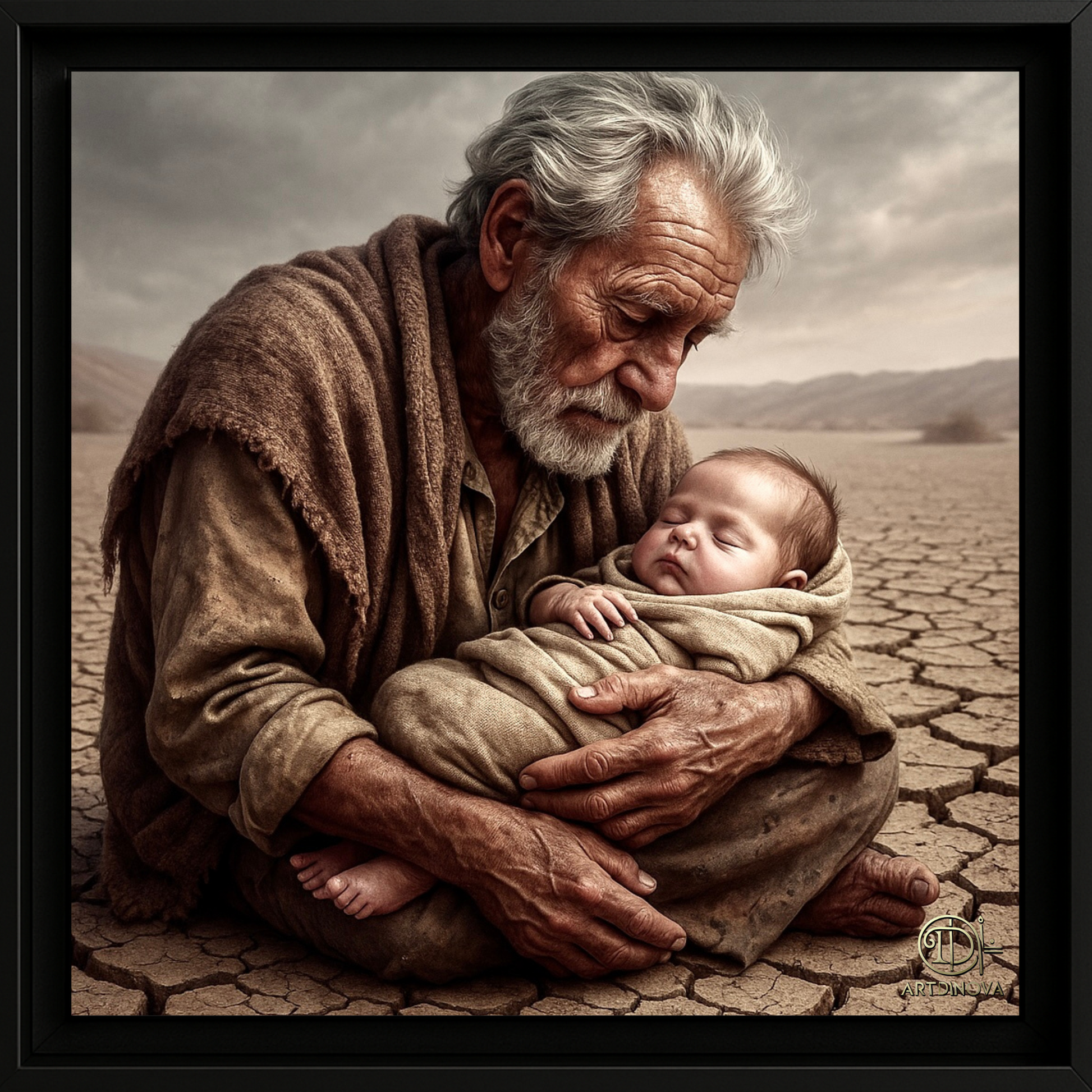 Dans un paysage aride et craquelé, un vieil homme tient tendrement un nourrisson endormi. Ses mains rugueuses, marquées par le temps et la dureté de la vie, enveloppent avec infinie douceur la peau délicate de l’enfant. Ses yeux se baissent vers lui avec une tendresse silencieuse, comme s’il confiait ses dernières forces à ce nouveau souffle.