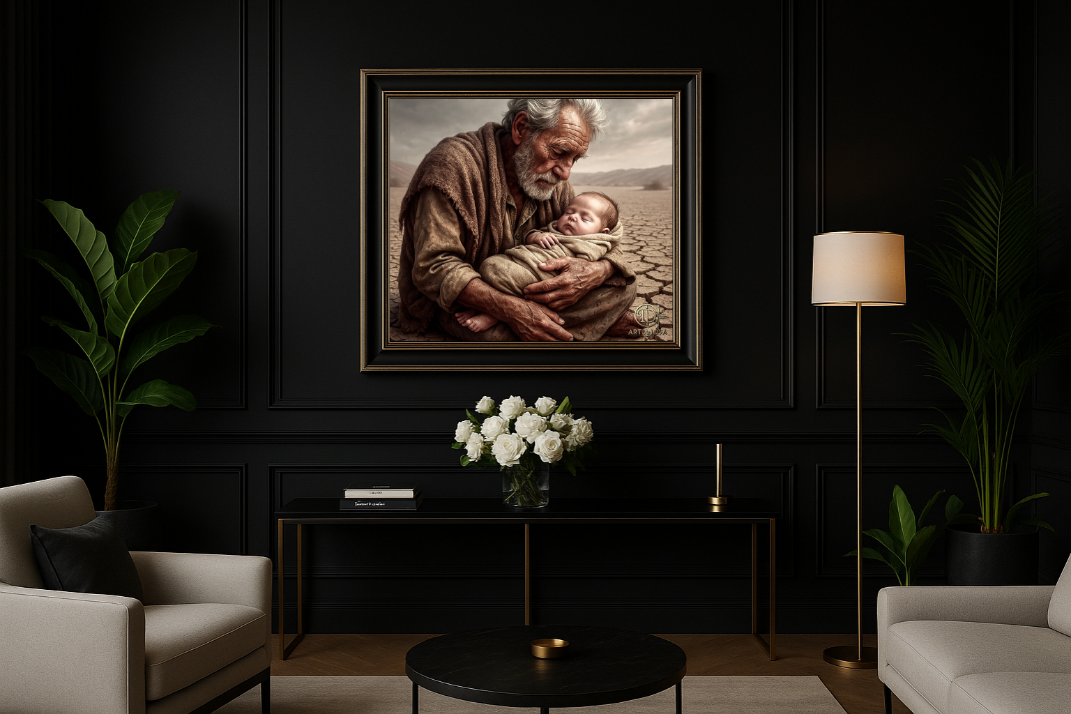 Héritage de Vie est une métaphore universelle de la transmission : la sagesse des anciens qui protège la fragilité des nouveaux-nés, le passé qui se penche sur l’avenir, la fin qui s’incline devant le commencement. Le contraste entre la terre fissurée, stérile, et la paix lumineuse du bébé révèle un message d’une puissance rare : même dans les terres les plus desséchées, la vie trouve toujours refuge et continuation.