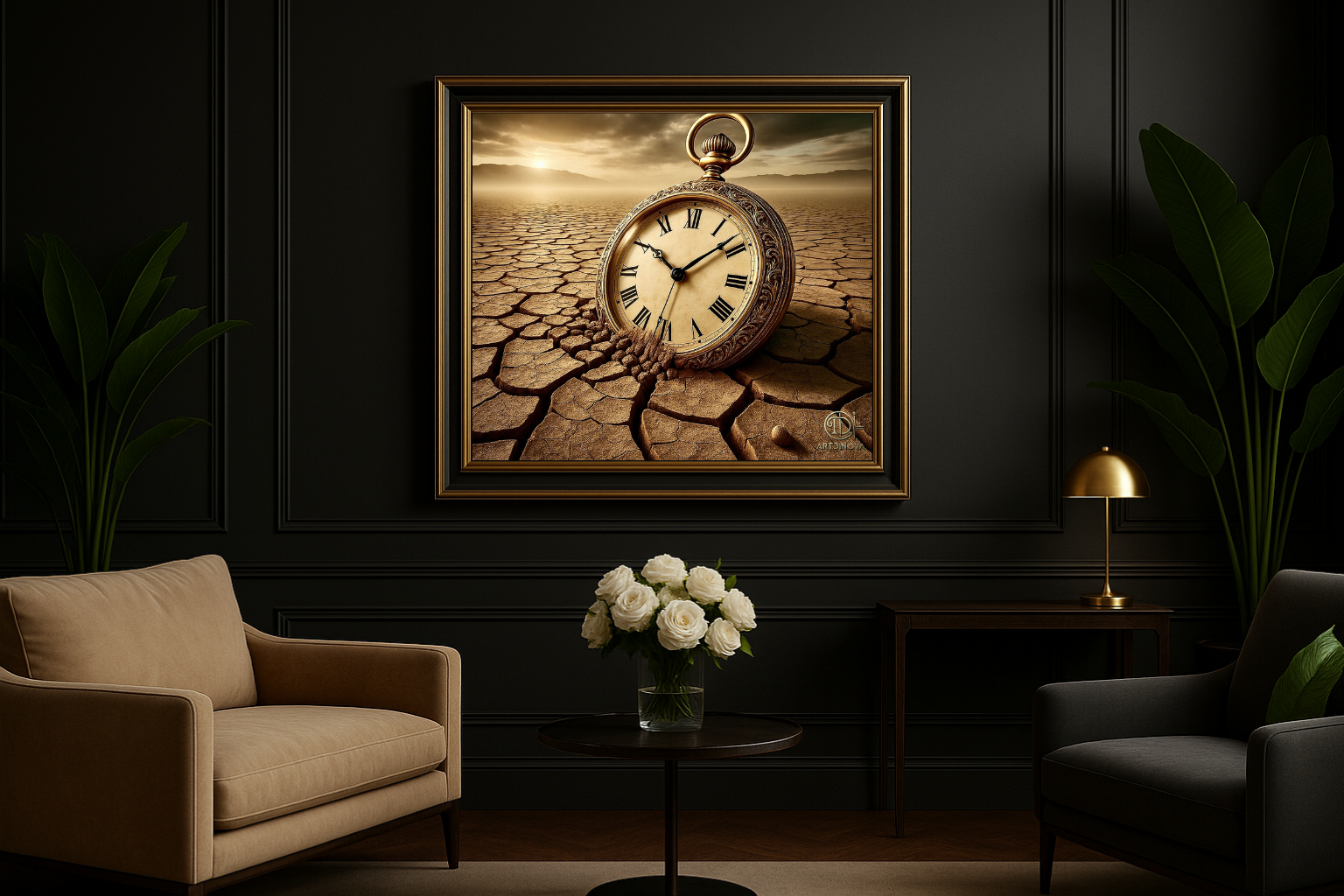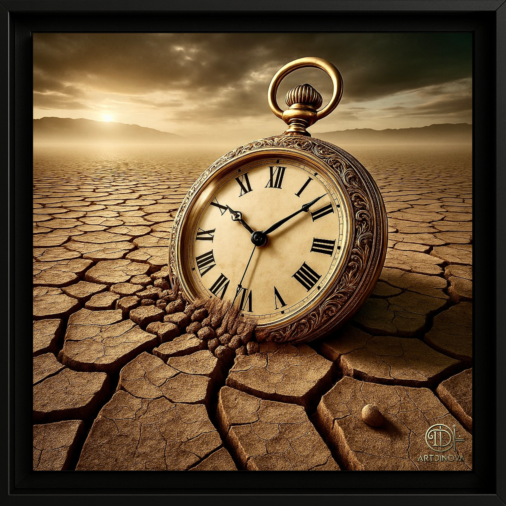 Une horloge monumentale, à moitié enfoncée dans un sol craquelé par la sécheresse, repose comme un vestige. Autour d’elle, l’horizon s’étend, brumeux, entre ciel menaçant et désert aride. Le contraste est saisissant : l’objet qui symbolise le temps humain s’érode, tandis que la Terre, elle, continue de témoigner du passage des siècles.