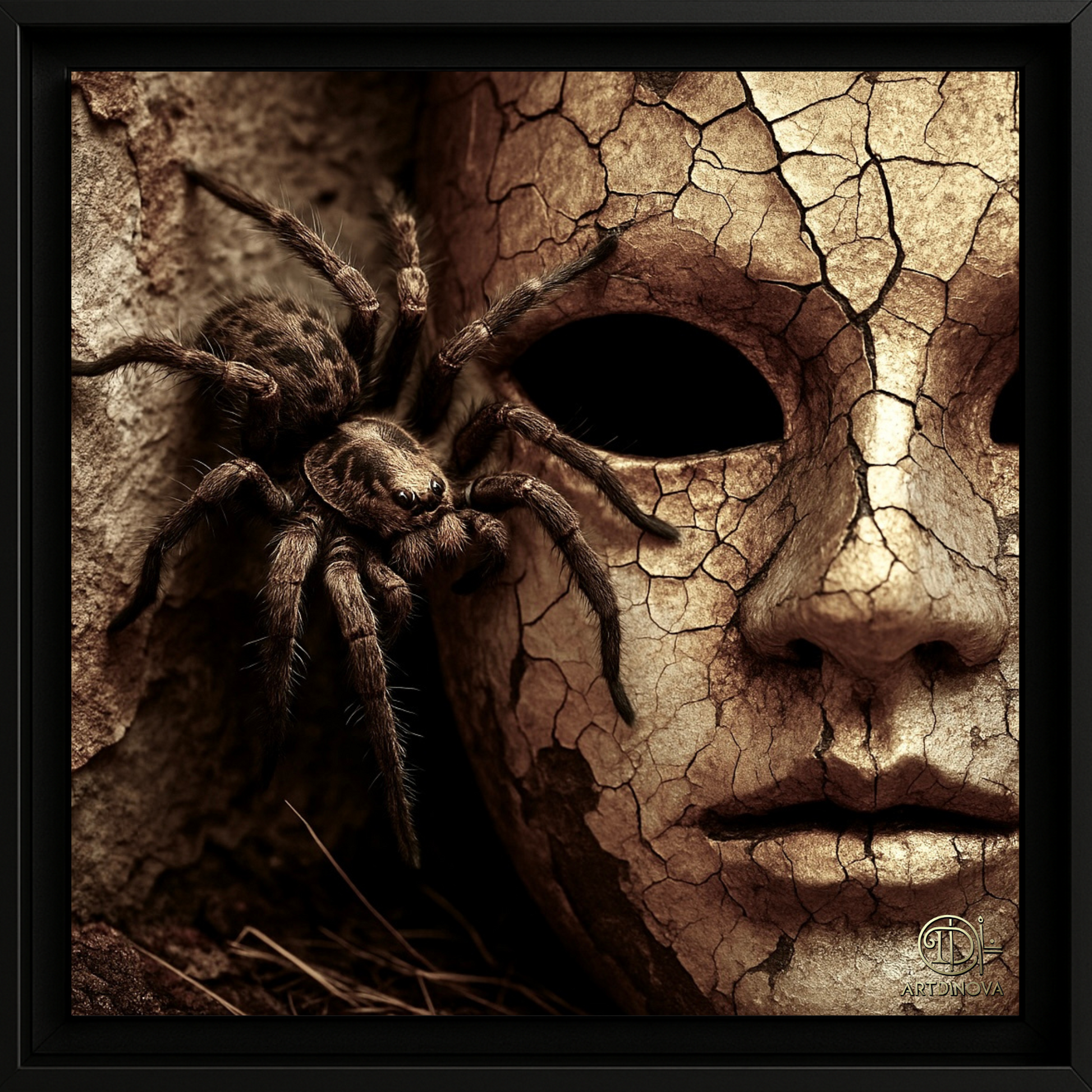 Un visage fissuré, semblable à un masque antique ou à une statue oubliée, repose dans l’ombre. À ses côtés, une araignée avance lentement, patiente, maîtresse de son territoire. Ensemble, ces deux présences créent une atmosphère de tension et de mystère : la beauté immobile de l’humain craquelé et la vitalité rusée de l’animal qui tisse.