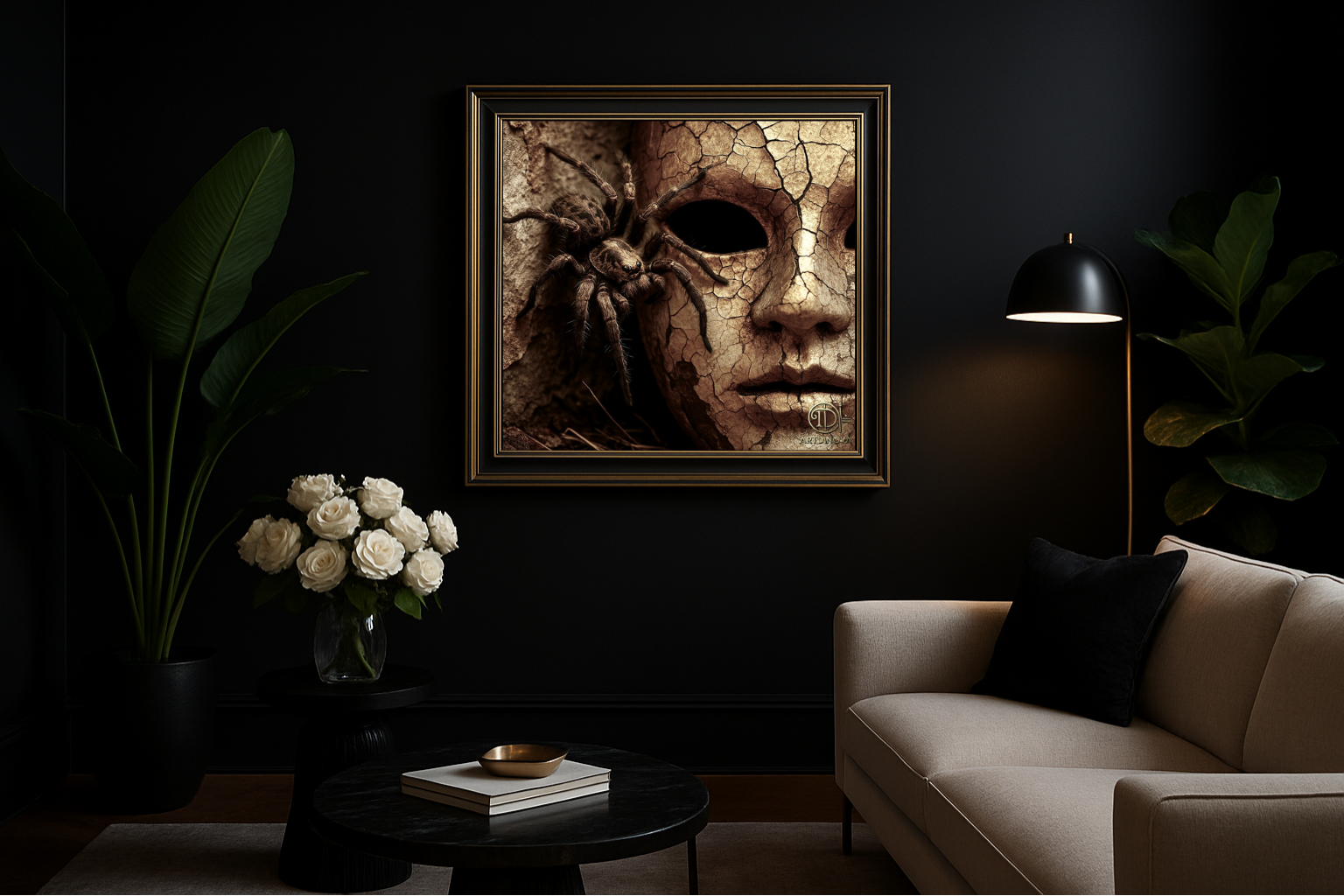 Le Gardien du Silence n’est pas une œuvre sur la peur, mais sur la cohabitation fragile entre l’homme et le vivant. L’araignée, souvent rejetée, devient ici symbole de persistance, d’ingéniosité et d’équilibre. Le masque fissuré, lui, incarne nos illusions de permanence, toujours rattrapées par la force de la nature.