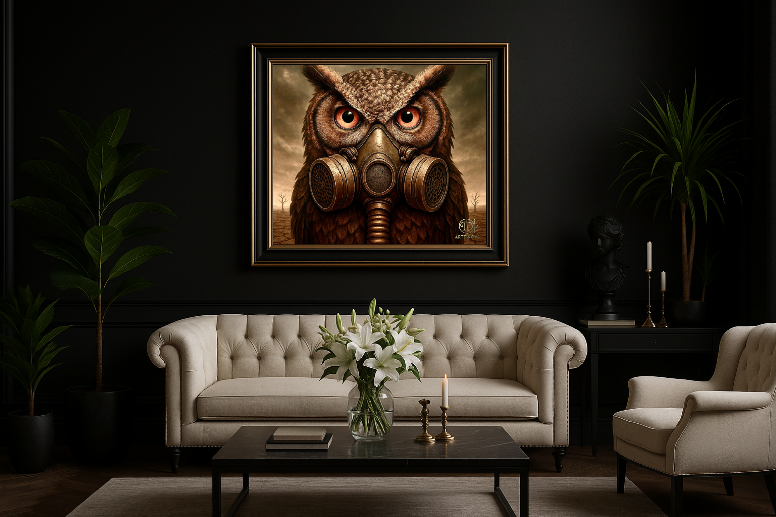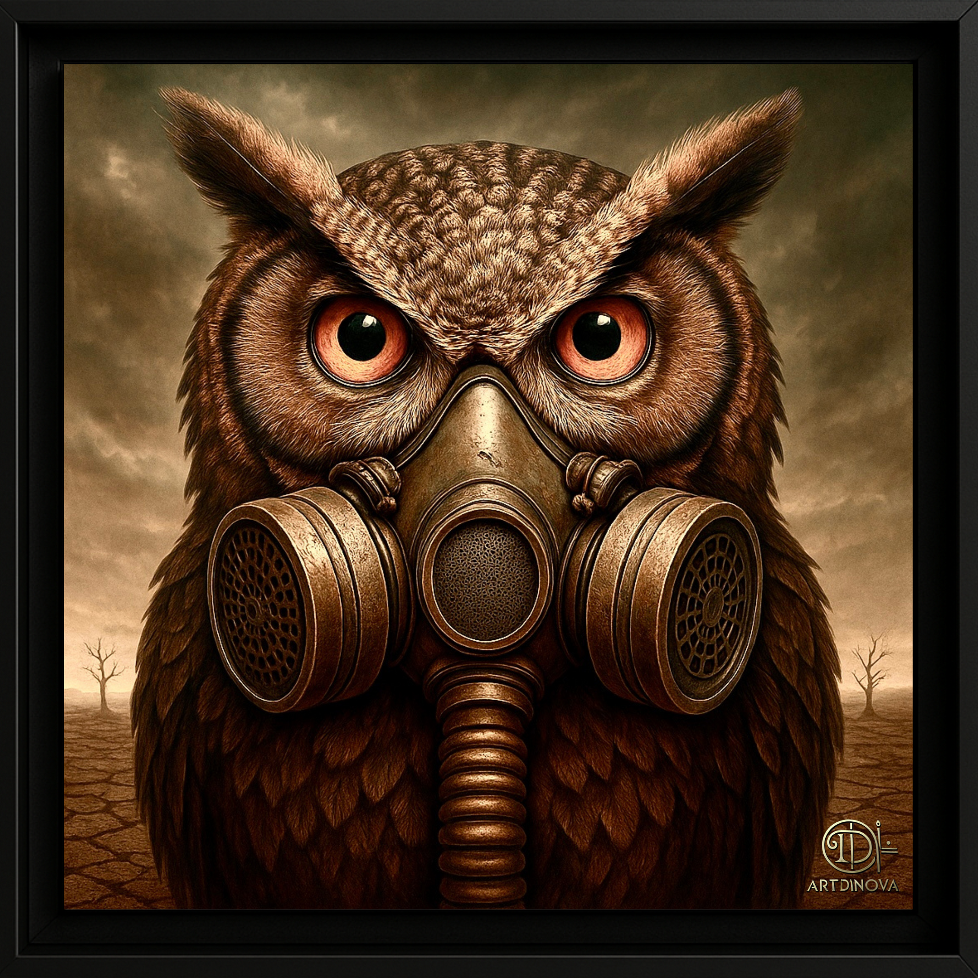 Un hibou, messager éternel de la sagesse, se dresse fièrement, un masque à gaz posé sur son bec. Son regard perçant traverse la poussière et le désert, rappelant que même dans la suffocation du monde, la clairvoyance survit.