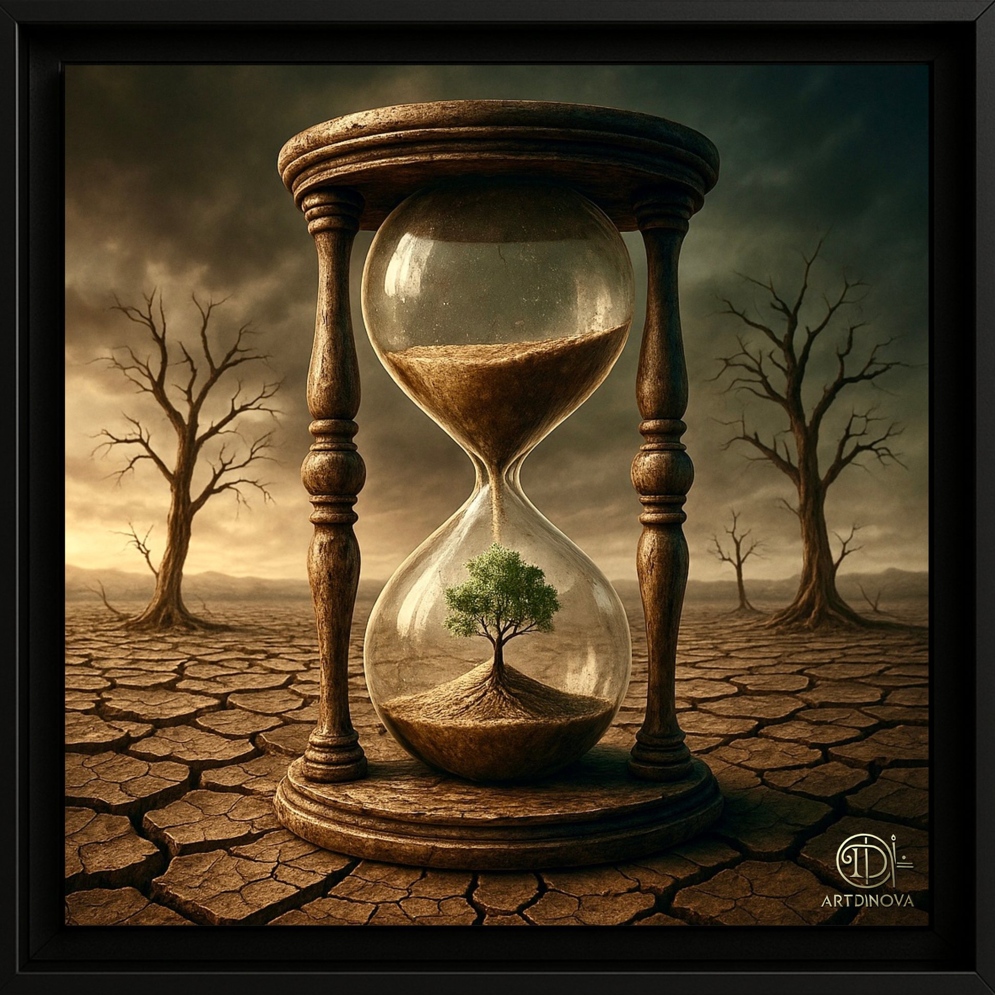 Au cœur d’un désert craquelé, un sablier monumental s’élève. Le sable s’écoule lentement vers la base, où un arbre fragile mais vibrant de vie pousse dans l’espace restreint.