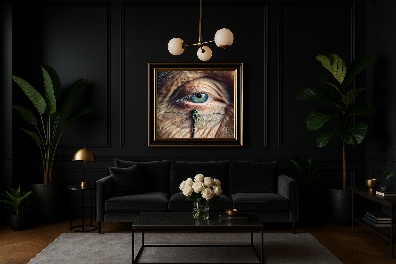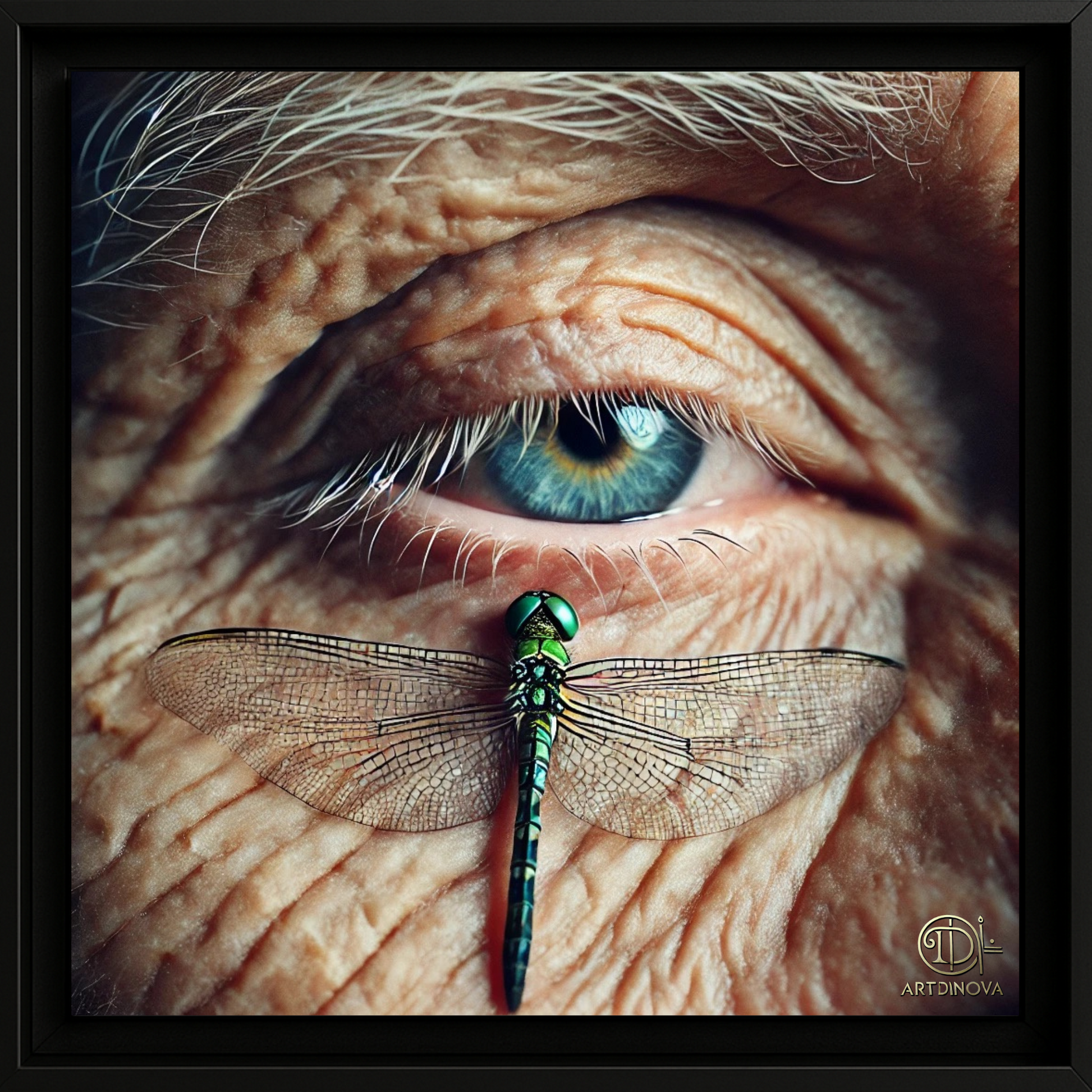 Un œil bleu, profondément marqué par les rides du temps, fixe le spectateur avec une intensité troublante. Sur cette paupière ridée s’est posée une libellule d’un vert éclatant, ses ailes translucides déployées comme une offrande. L’opposition est saisissante : la lourdeur des années et la légèreté de l’instant, la gravité de l’humain et la grâce fragile de la nature.
