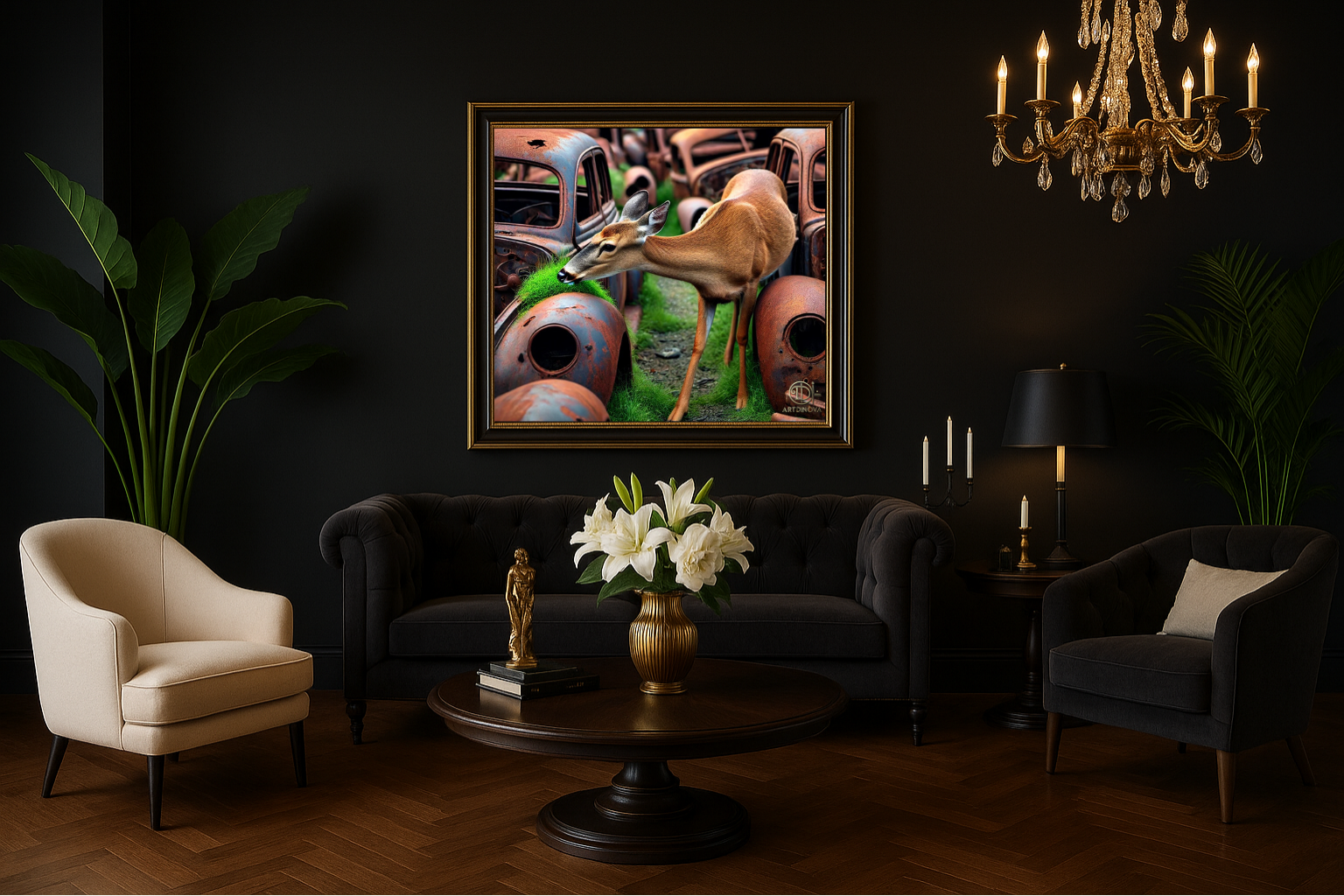 Au milieu d’un cimetière de carcasses rouillées, une biche s’avance et trouve sa nourriture dans un éclat de verdure qui renaît de l’acier mort. Le contraste est saisissant : la douceur fragile de la vie face au poids du métal oublié.